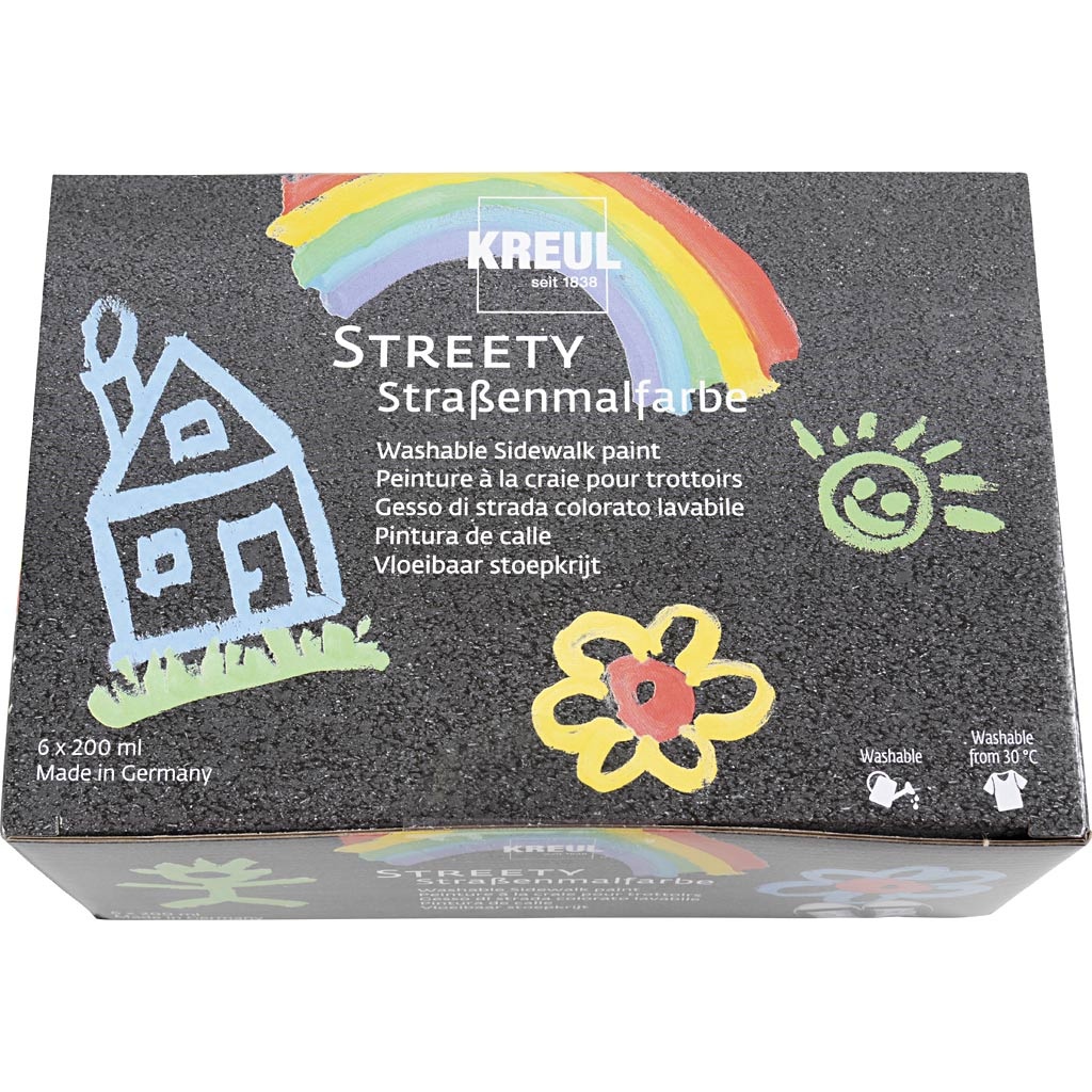 Met de stoepkrijtverf in een set van zes flessen à 200 ml per doos kunnen kinderen en volwassenen hun creativiteit de vrije loop laten op stoepen, terrassen en pleinen. Deze verf is speciaal ontwikkeld voor buitentoepassing en kan eenvoudig weer van harde oppervlakken worden verwijderd, ideaal voor tijdelijke tekeningen, spelletjes of educatieve activiteiten.