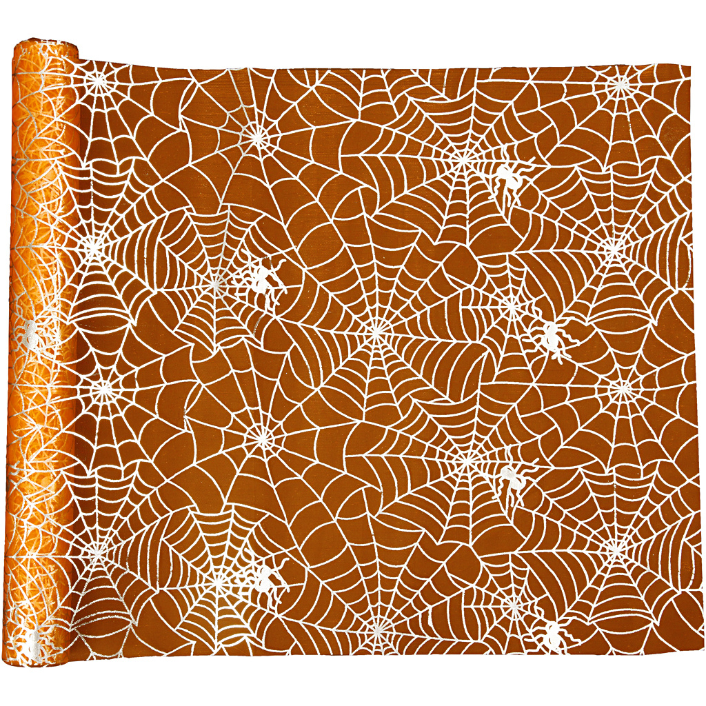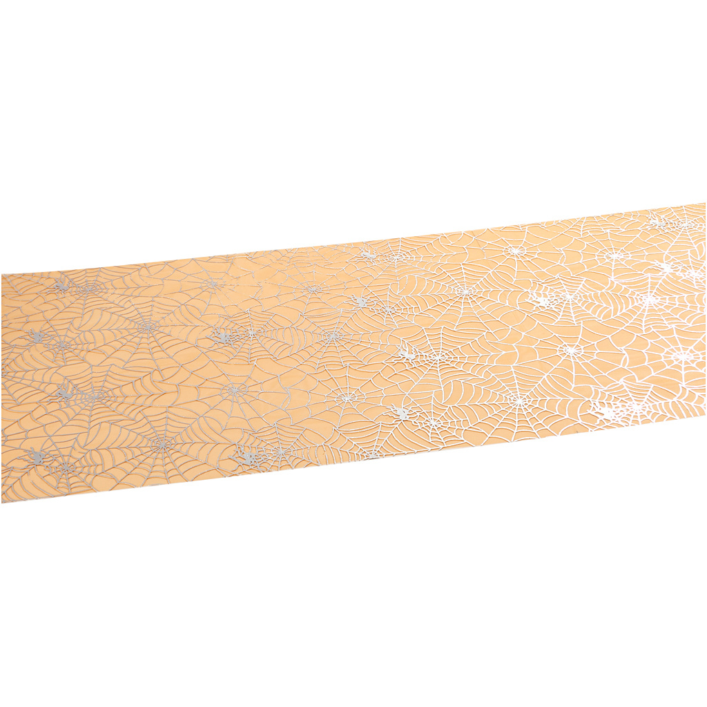 Tafelloper van organza in zilver bedrukt met spinnen en spinnewebben