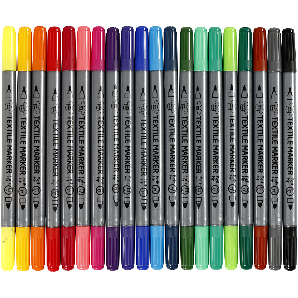 Permanente textielstiften met aan elke uiteinde een vilten punt in verschillende dikte. Je kunt ze gebruiken om nieuw en oud textiel te decoreren