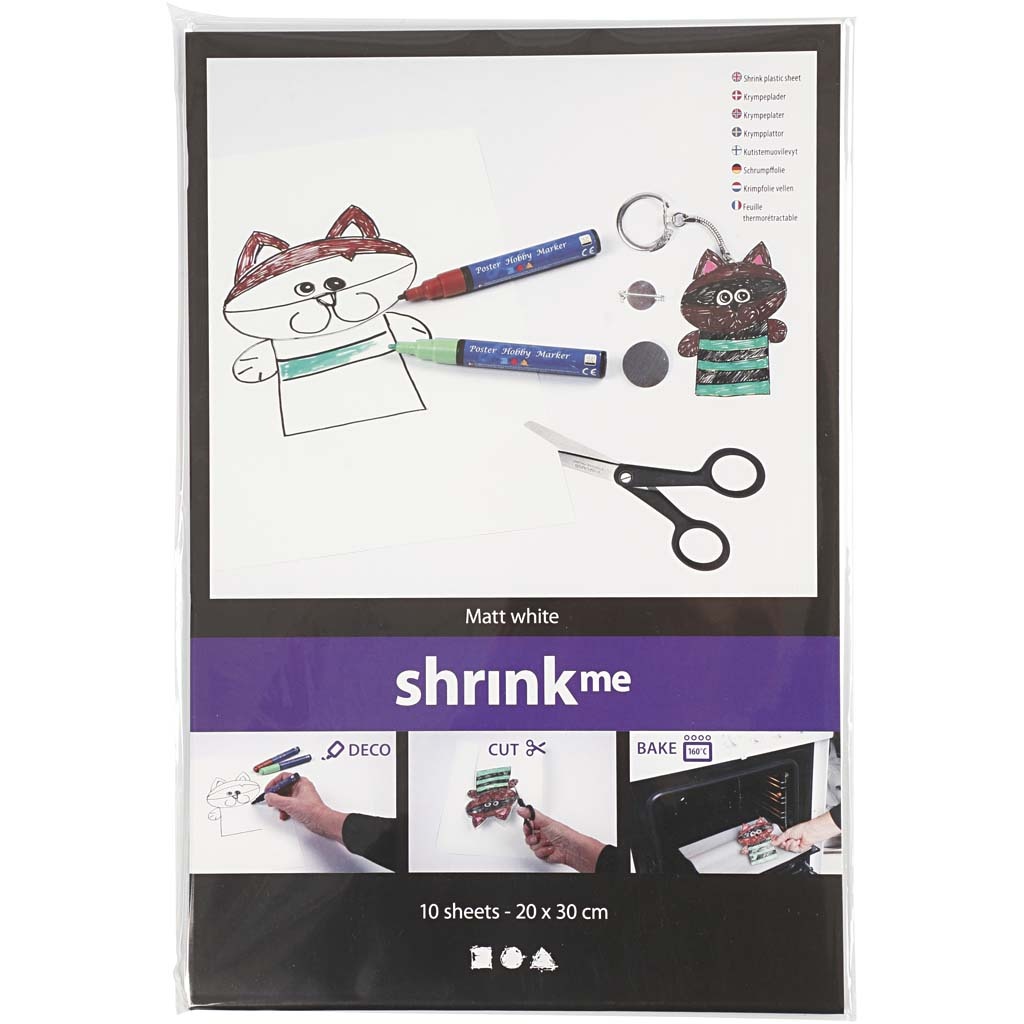 De vellen krimpfolie van Creativ Company zijn ideaal voor diverse knutselprojecten en creatieve toepassingen. Deze verpakking bevat tien vellen van 20 bij 30 centimeter, gemaakt van matwit plastic met een dikte van 0,3 millimeter. Het materiaal laat zich eenvoudig knippen, tekenen en kleuren, waardoor het perfect is voor het maken van sieraden, sleutelhangers of gepersonaliseerde accessoires.
