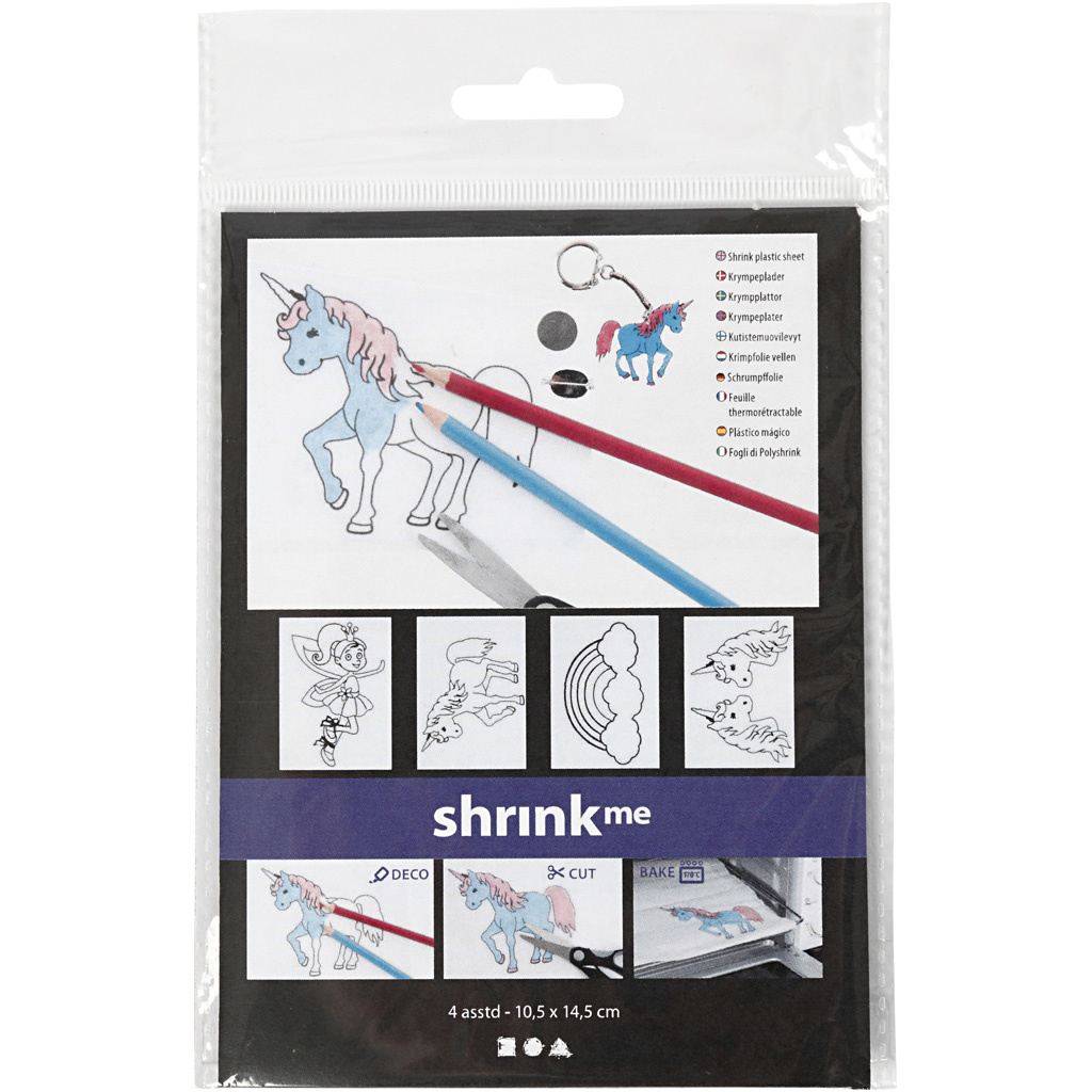 Creativ Company Vellen krimpfolie met motieven, unicorn, vel 10,5x14,5 cm, dikte 0,3 mm, mat transparant, 4 vel/ 1 doos