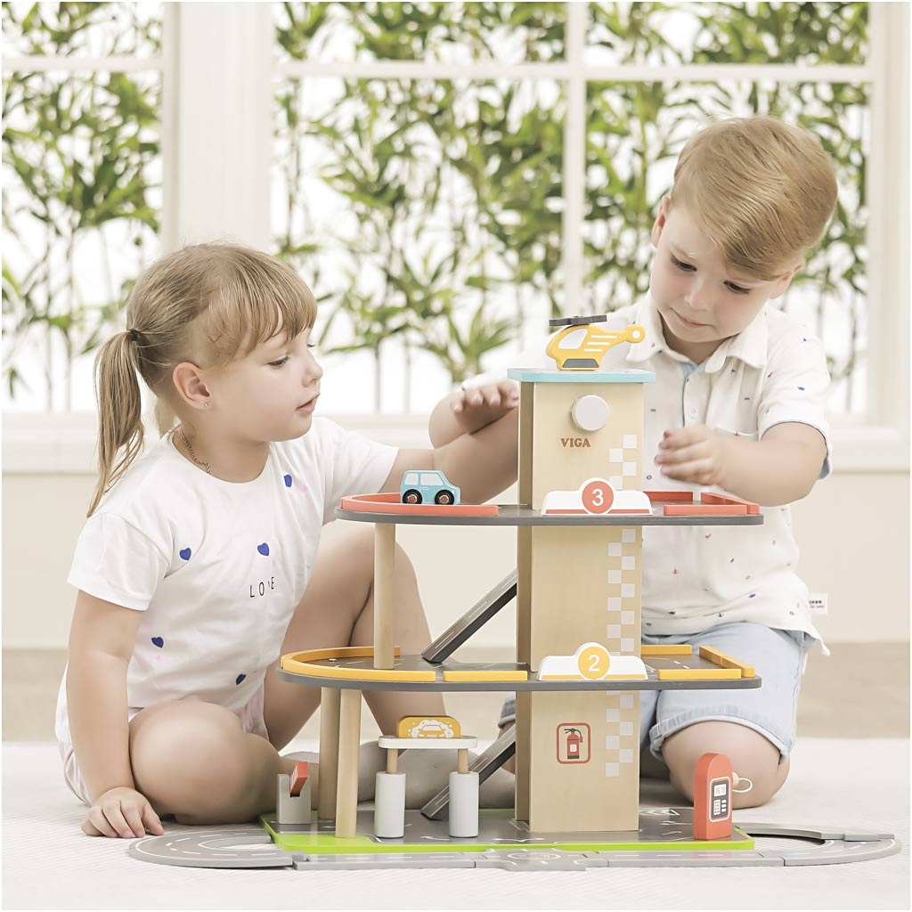 De VIGA speelgoedgarage is een prachtige houten speelset waarmee kinderen hun fantasie de vrije loop kunnen laten. Deze garage van het merk VIGA is vervaardigd uit stevig hout, wat zorgt voor duurzaamheid en een natuurlijke uitstraling. Met royale afmetingen van 73 bij 45 bij 40,5 cm biedt het voldoende ruimte om met meerdere autootjes tegelijk te spelen.