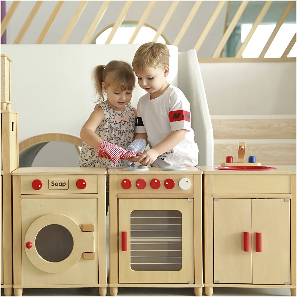 Dankzij het stevige hout is de keuken duurzaam en veilig voor intensief gebruik, zowel thuis als op scholen of kinderdagverblijven. De neutrale uitstraling van het materiaal past moeiteloos in elke speel- of woonruimte. Combineer deze speelkeuken met houten accessoires voor extra realisme en laat kinderen verschillende 'kooktaken' nabootsen, wat hun motorische vaardigheden en fantasie stimuleert.