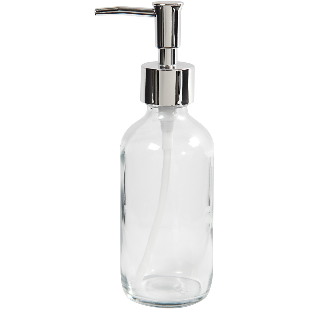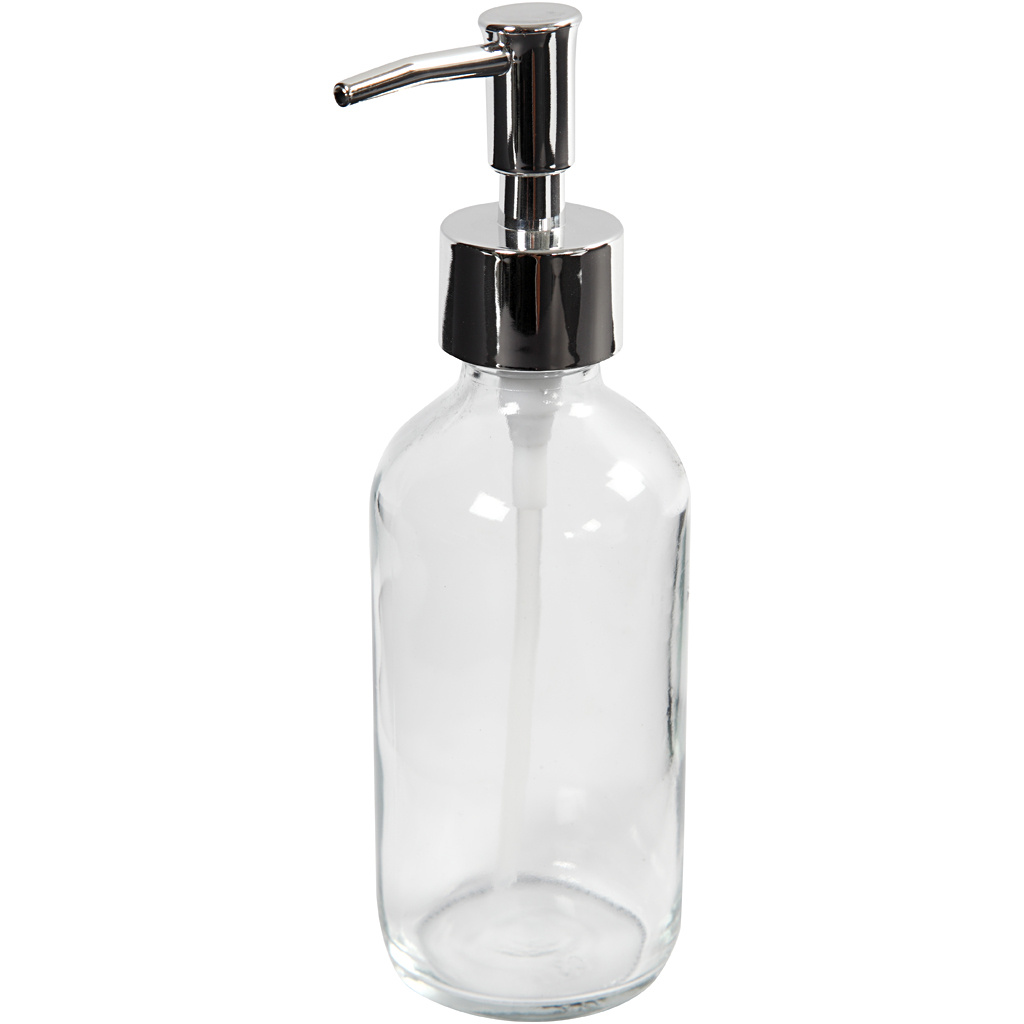 Cilindrische zeepdispenser van helder glas met een metalen pomp van kunststof. Versier de zeepdispenser met glas- en porseleinstiften, porseleinverf etc.